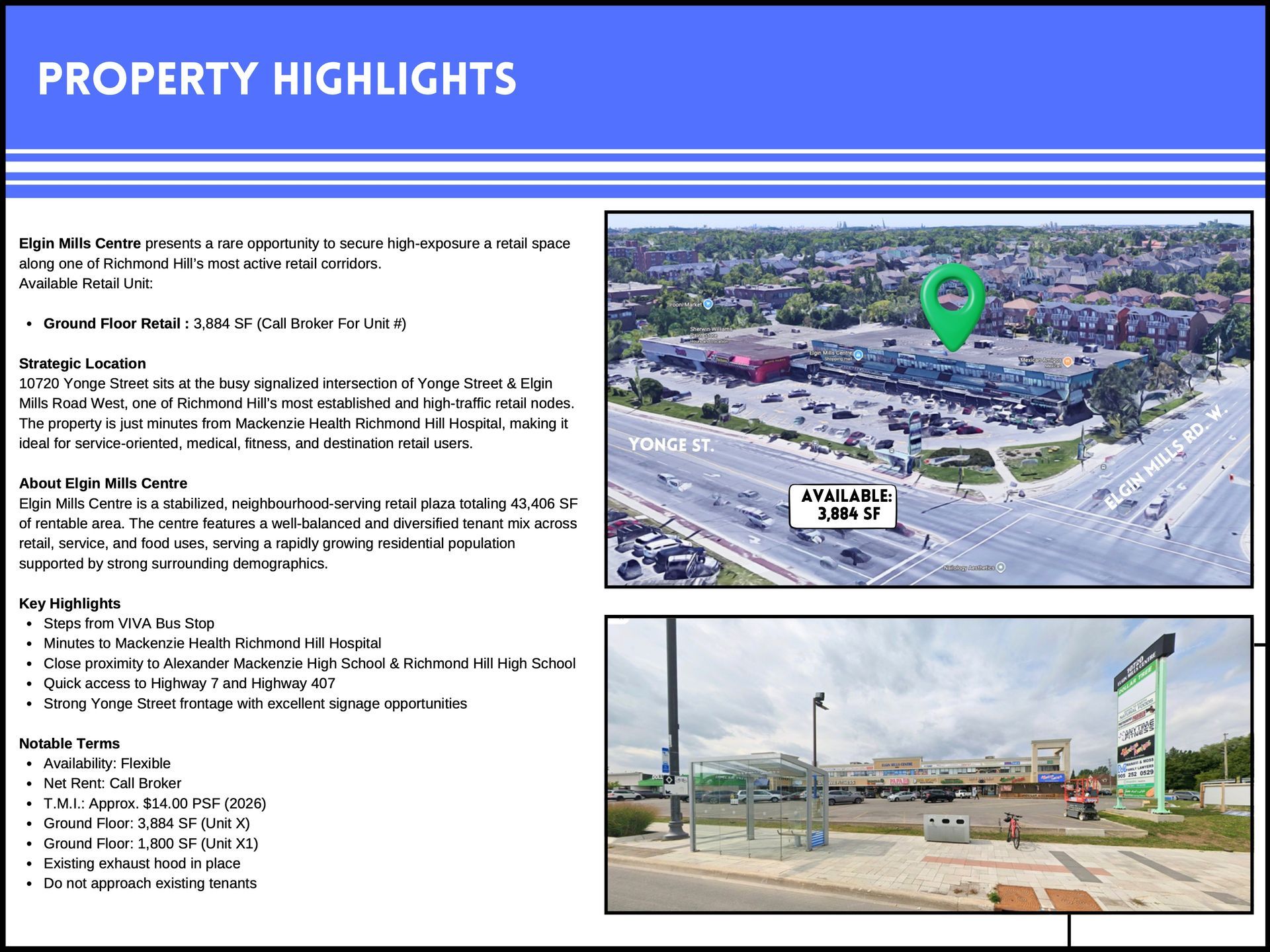 The property is just minutes from Mackenzie Health Richmond Hill Hospital, making it ideal for service-oriented, medical, fitness, and destination retail users.