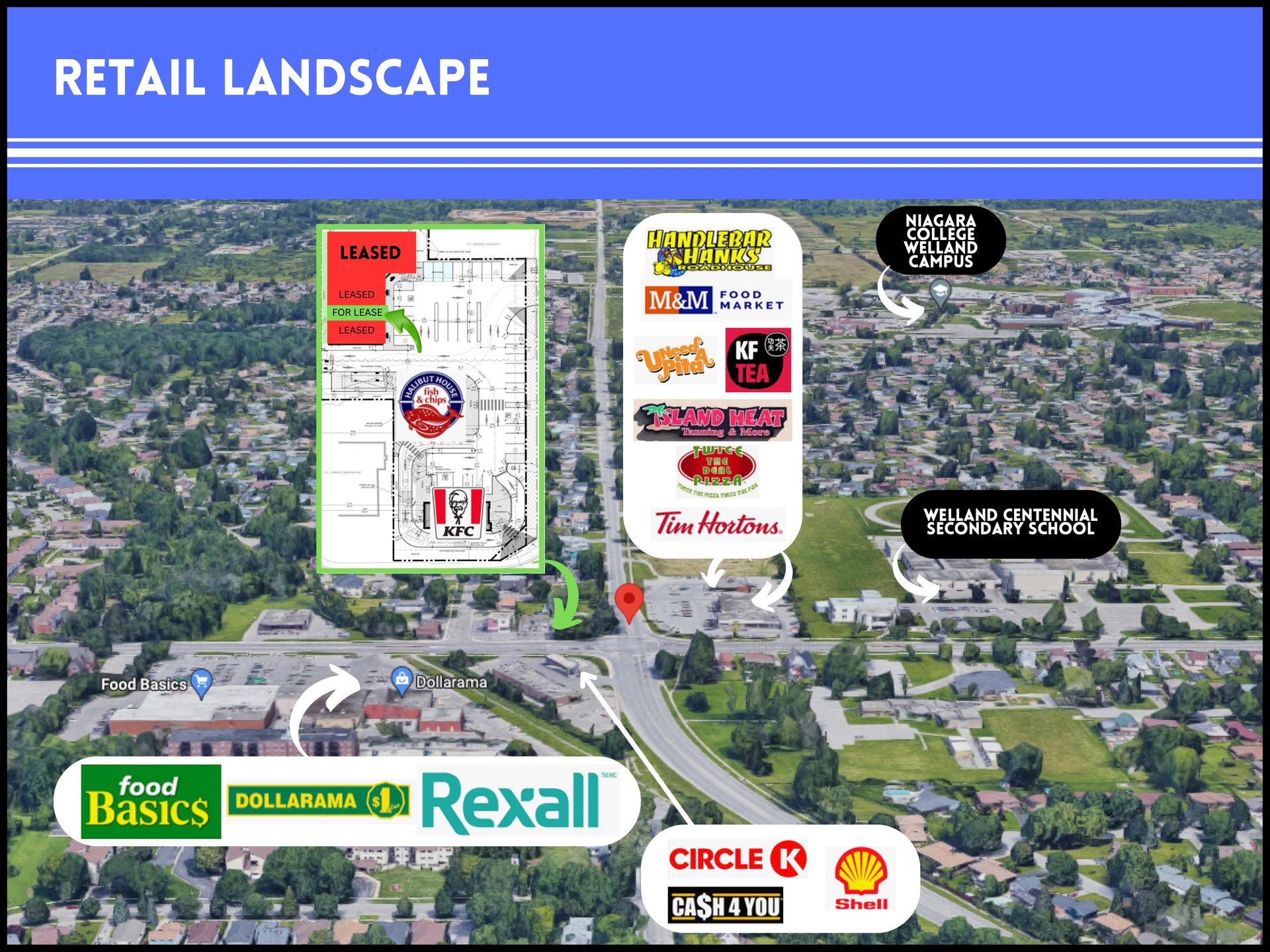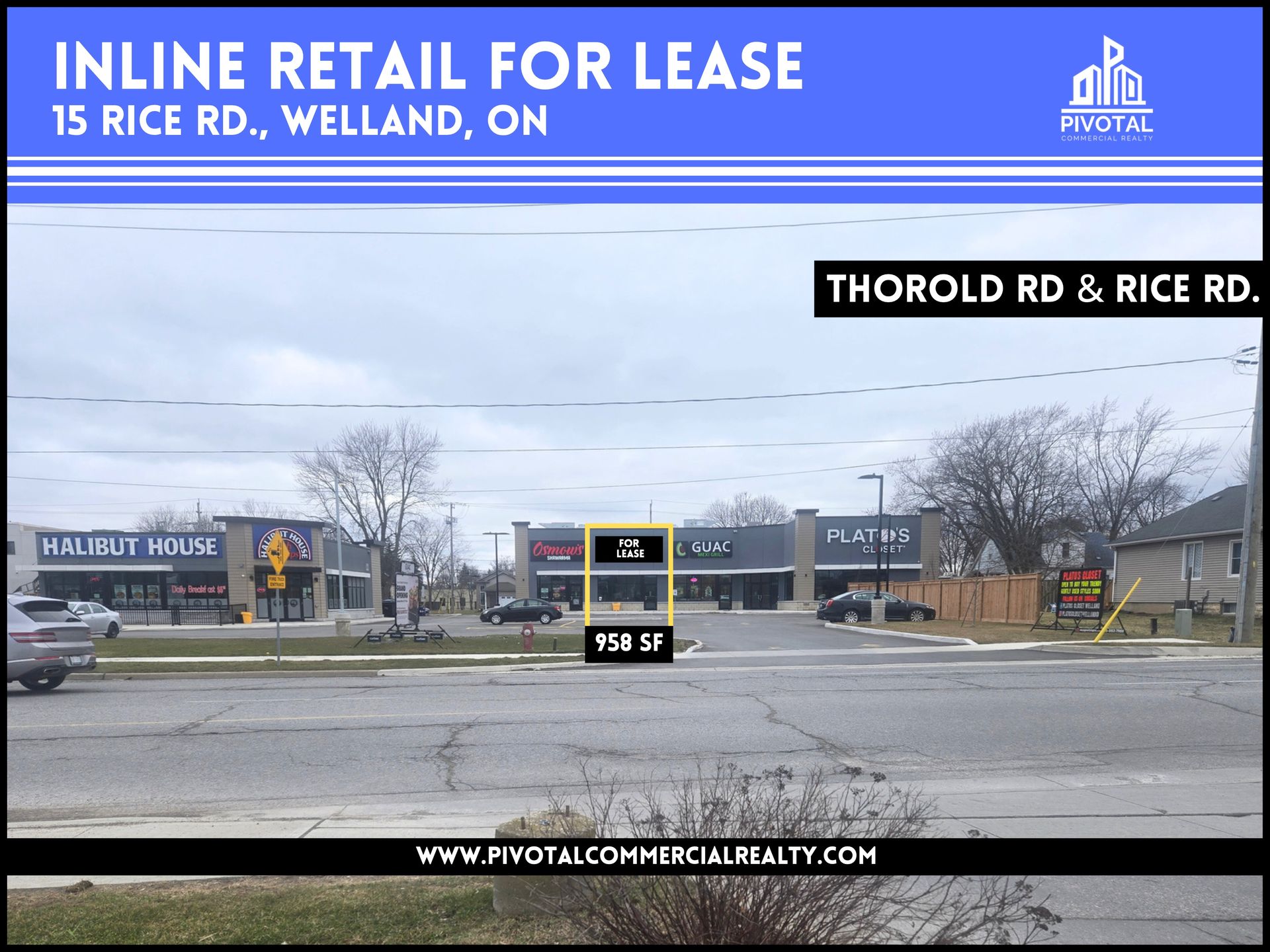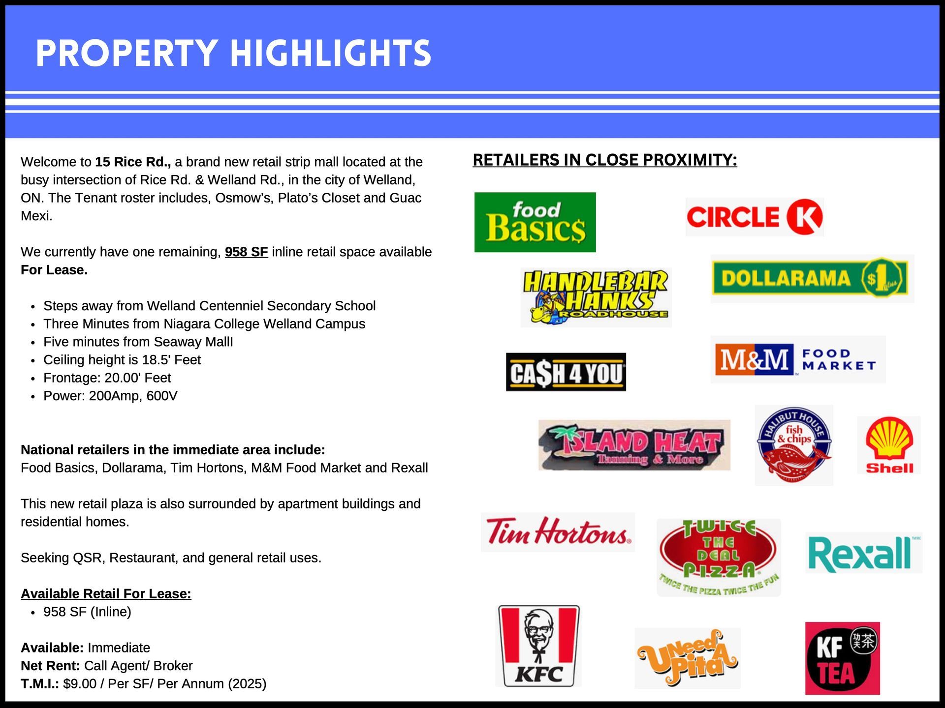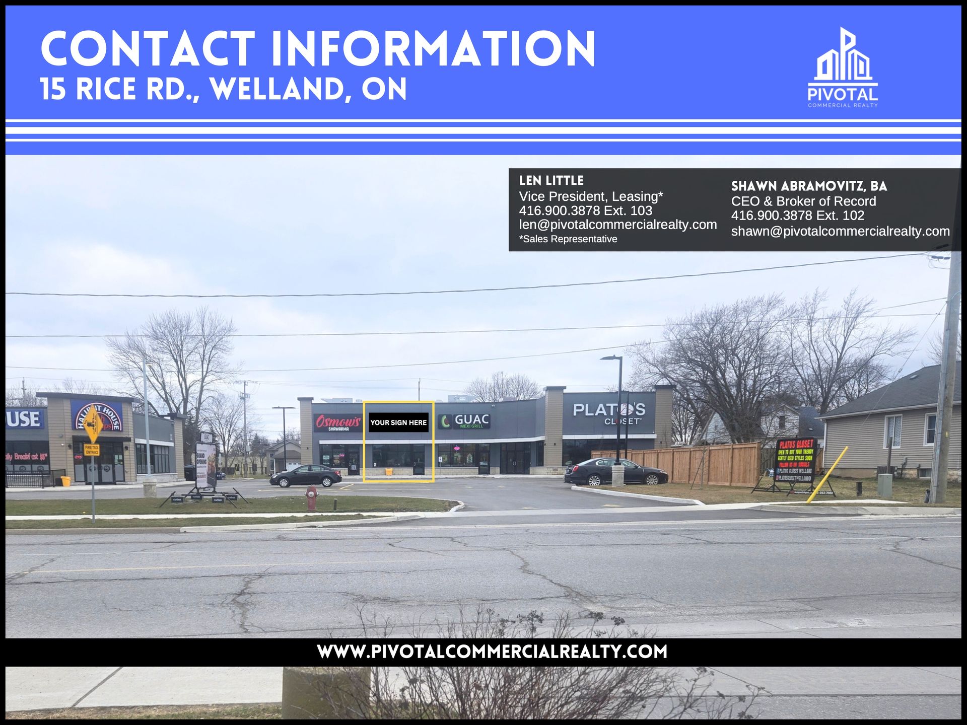 Welcome to 15 Rice Rd., a brand new retail strip mall located at the busy intersection of Rice Rd. & Welland Rd., in the city of Welland, ON. The Tenant roster includes, Osmow's, Plato's Closet and Guac Mexi.