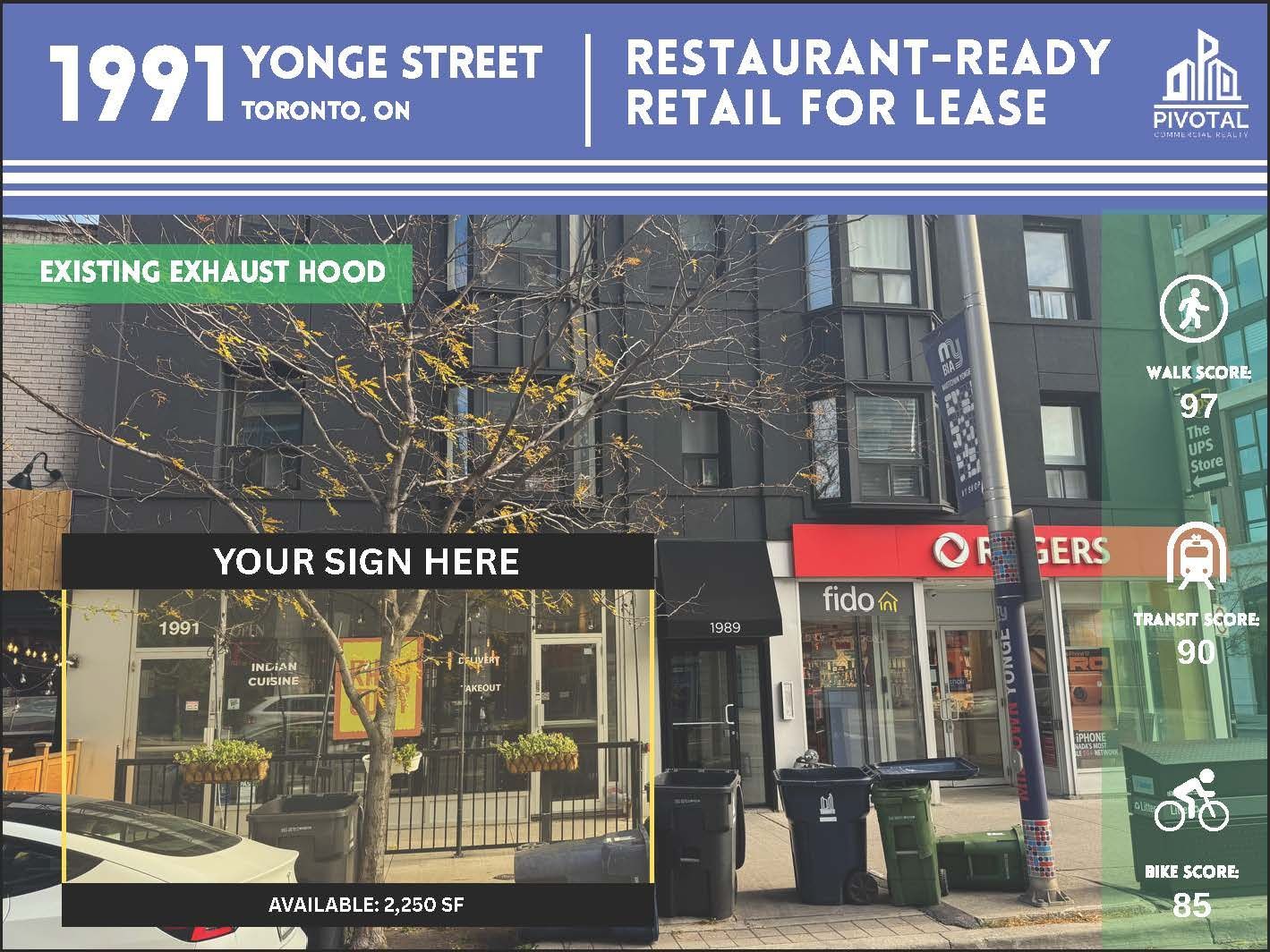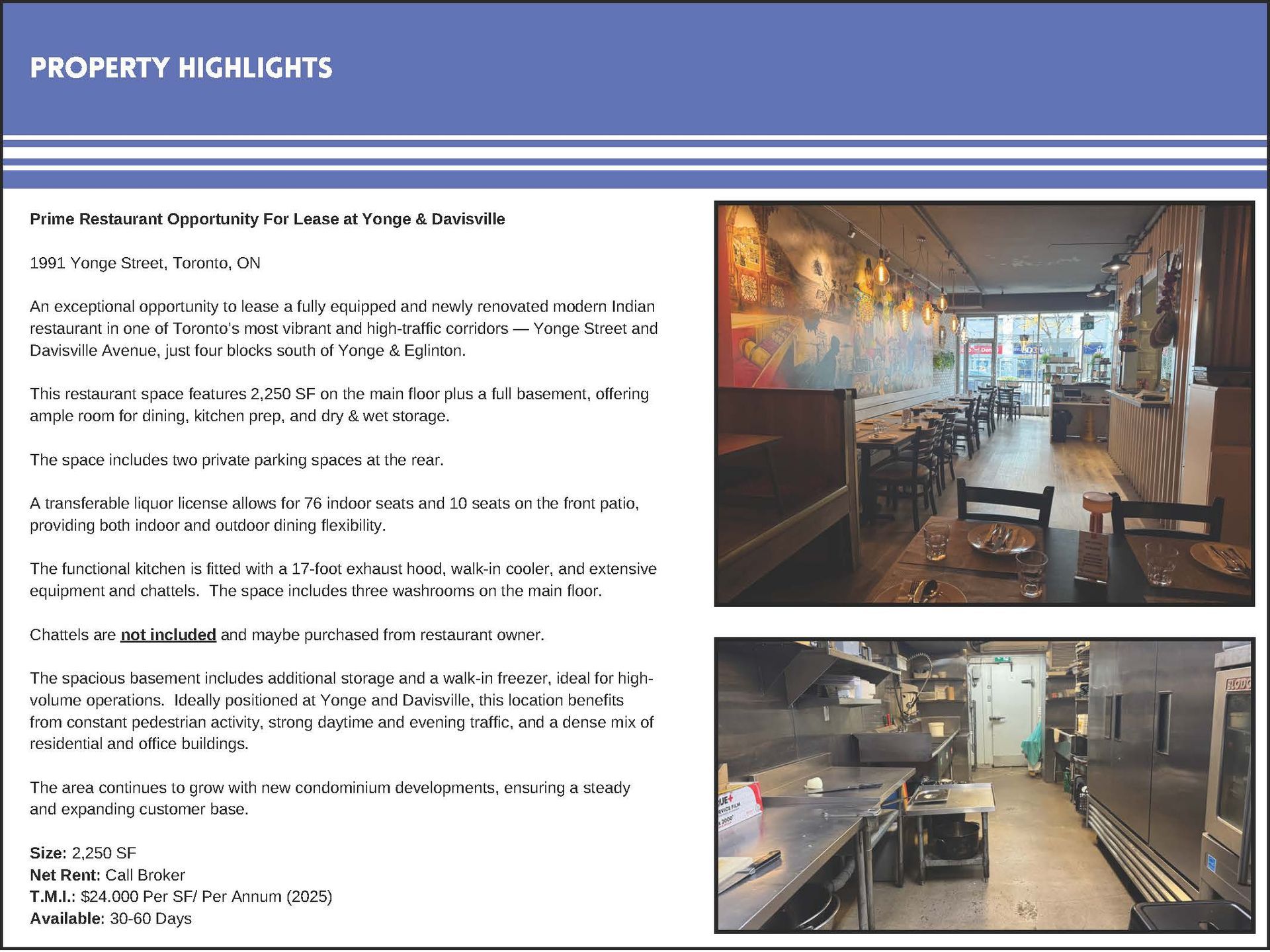 An exceptional opportunity to lease a fully equipped and newly renovated modern Indian restaurant in one of Toronto's most vibrant and high-traffic corridors - Yonge Street and Davisville Avenue, just four blocks south of Yonge & Eglinton.