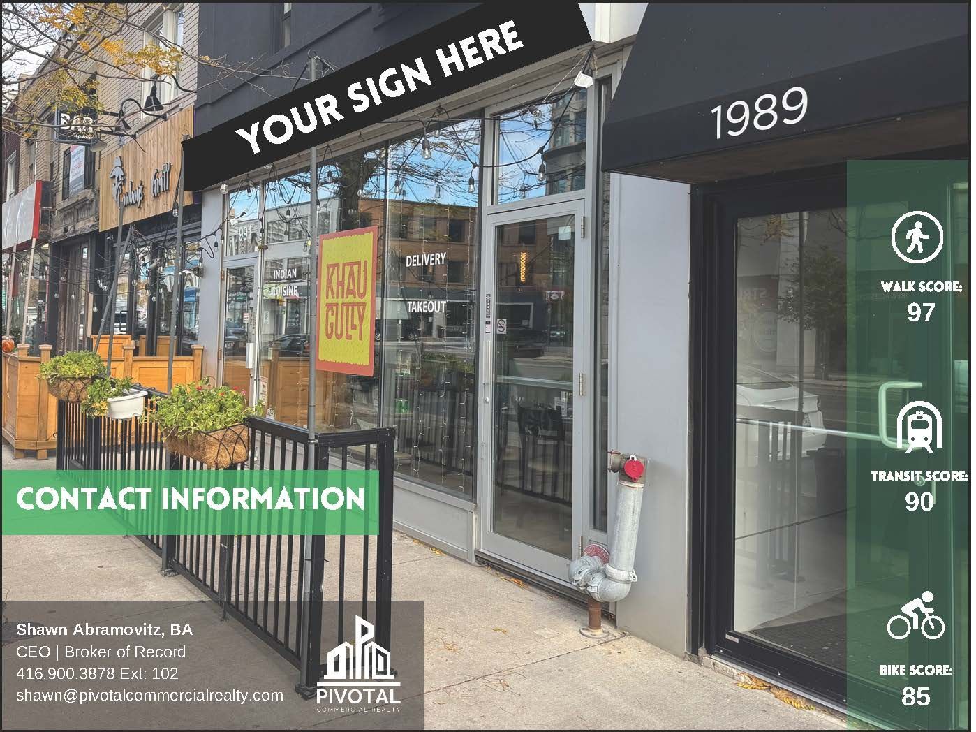 The spacious basement includes additional storage and a walk-in freezer, ideal for high-volume operations. Ideally positioned at Yonge and Davisville, this location benefits from constant pedestrian activity, strong daytime and evening traffic, and a dense mix of residential and office buildings.