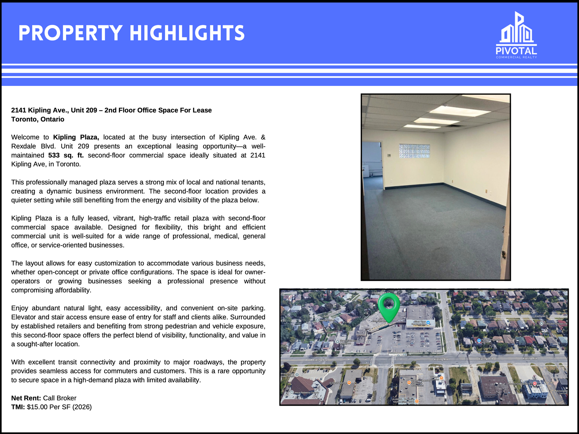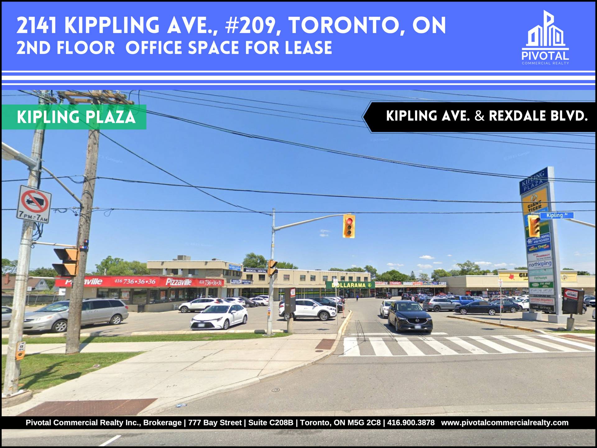 Welcome to Kipling Plaza, located at the busy intersection of Kipling Ave. & Rexdale Blvd. Unit 209 presents an exceptional leasing opportunity—a wellmaintained 533 sq. ft. second-floor commercial space ideally situated at 2141 Kipling Ave, in Toronto.