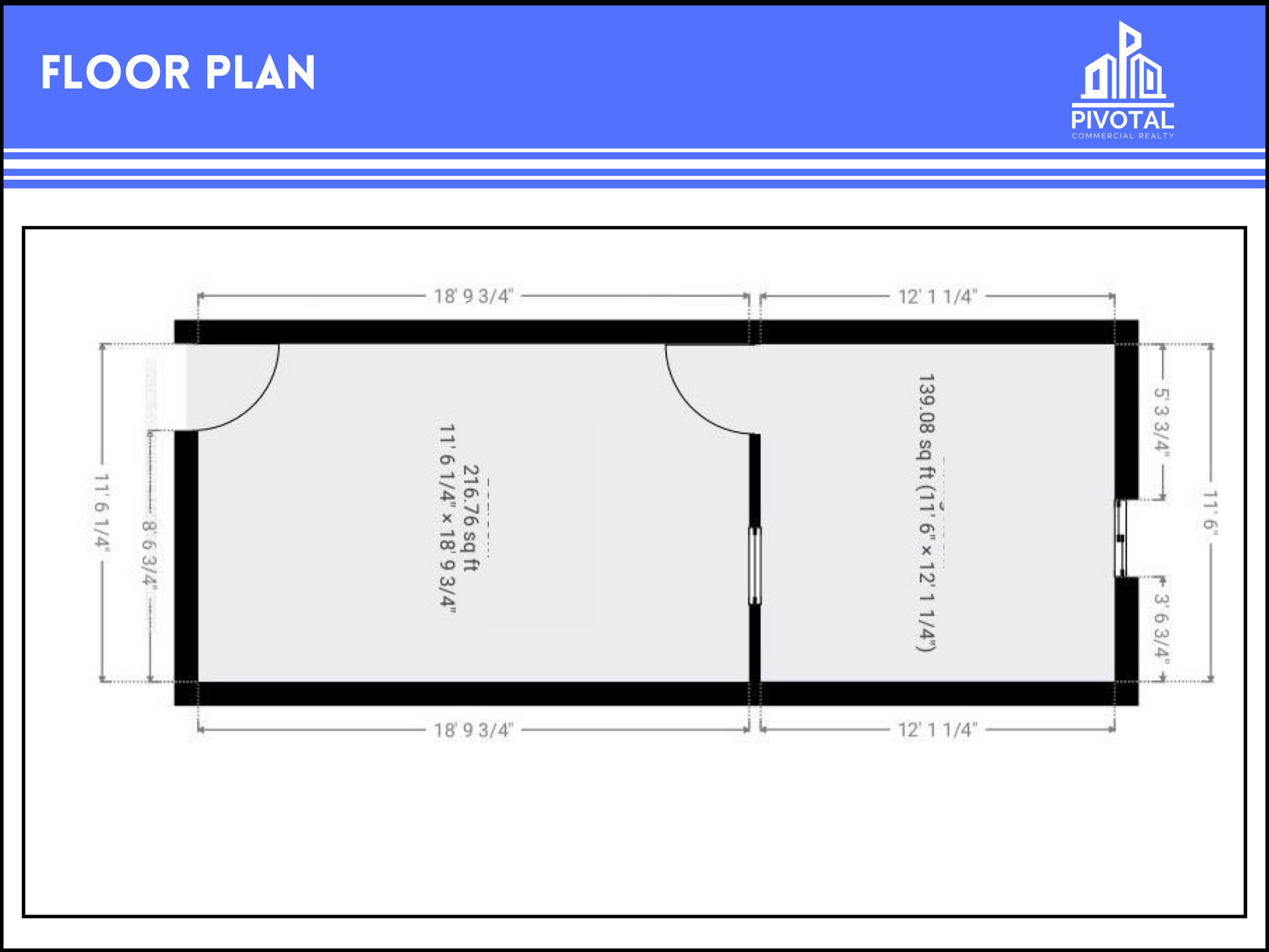 The layout allows for easy customization to accommodate various business needs, whether open-concept or private office configurations. The space is ideal for owneroperators or growing businesses seeking a professional presence without compromising affordability.