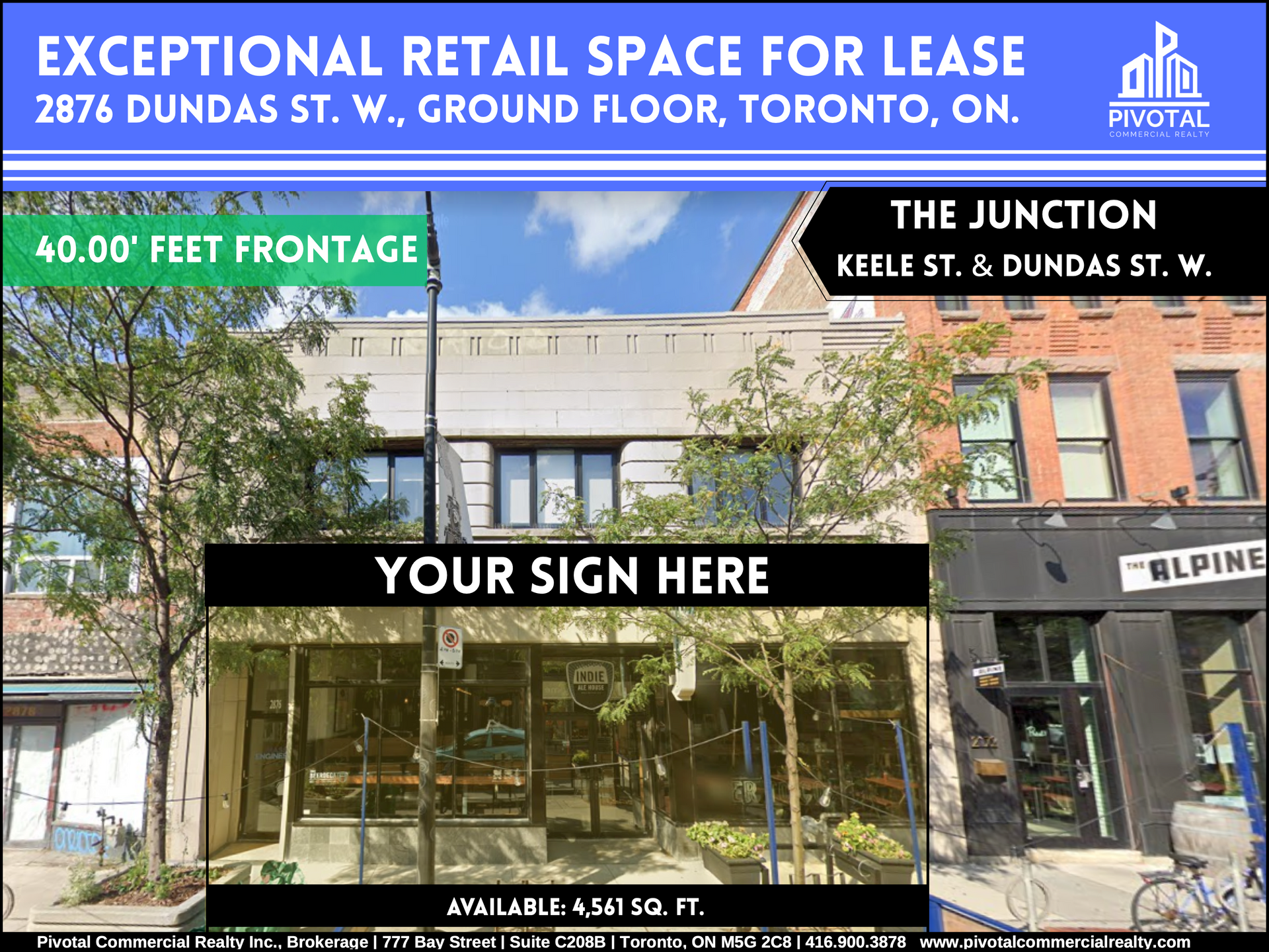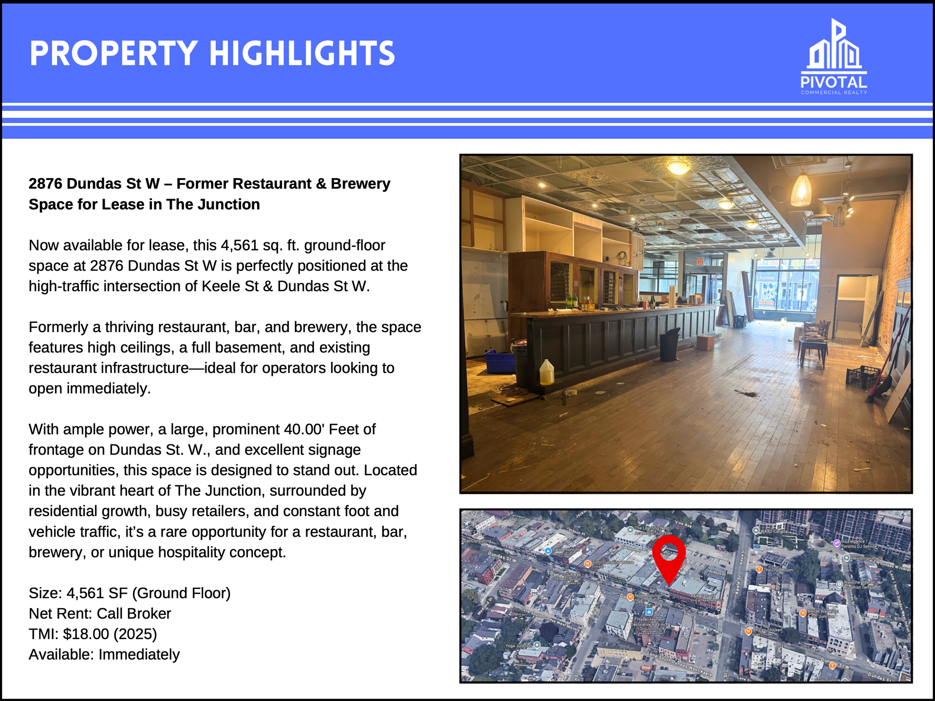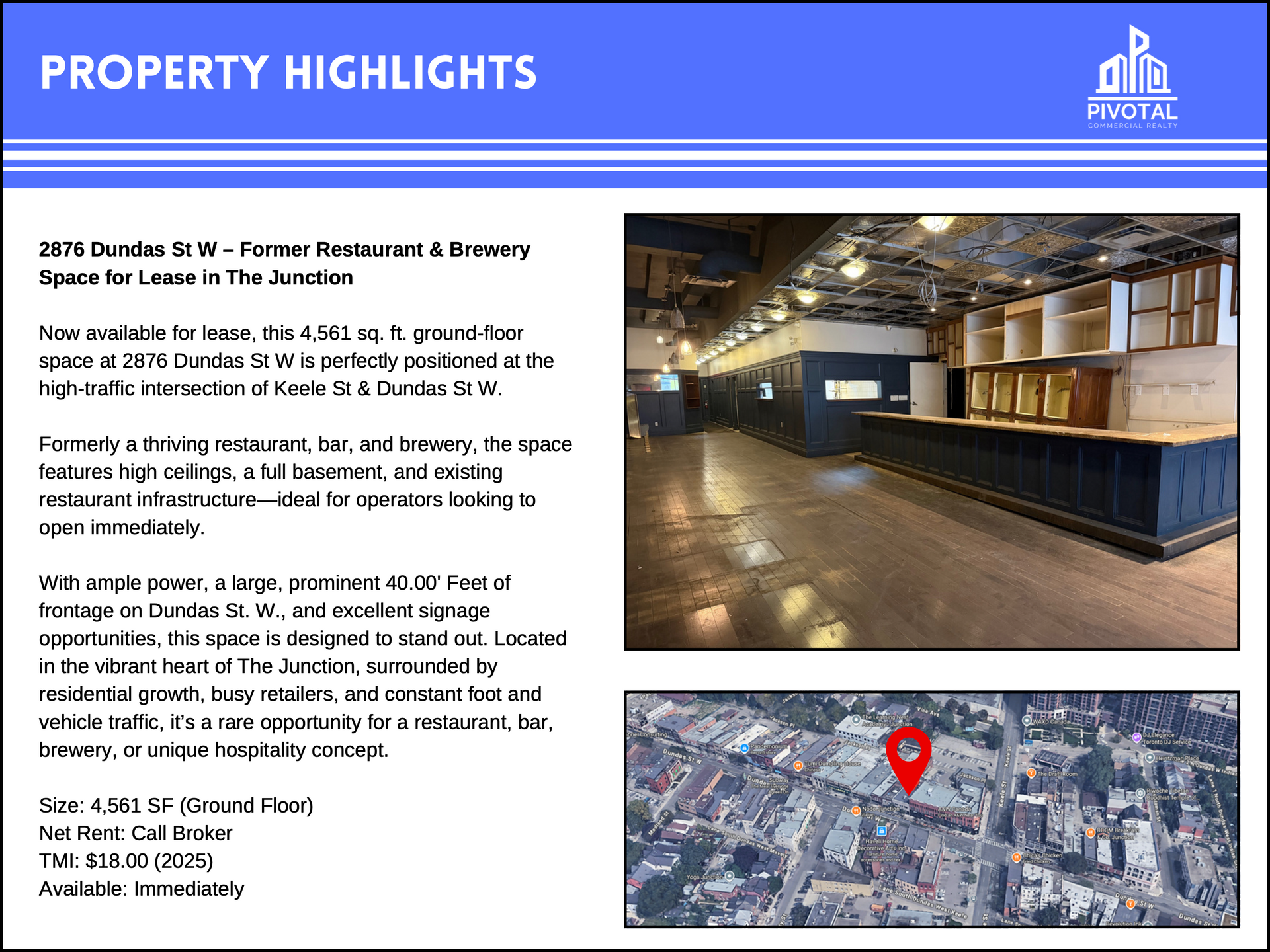 With ample power, a large, prominent 40.00' Feet of frontage on Dundas St. W., and excellent signage opportunities, this space is designed to stand out. Located in the vibrant heart of The Junction, surrounded by residential growth, busy retailers, and constant foot and vehicle traffic, it’s a rare opportunity for a restaurant, bar, brewery, or unique hospitality concept.
