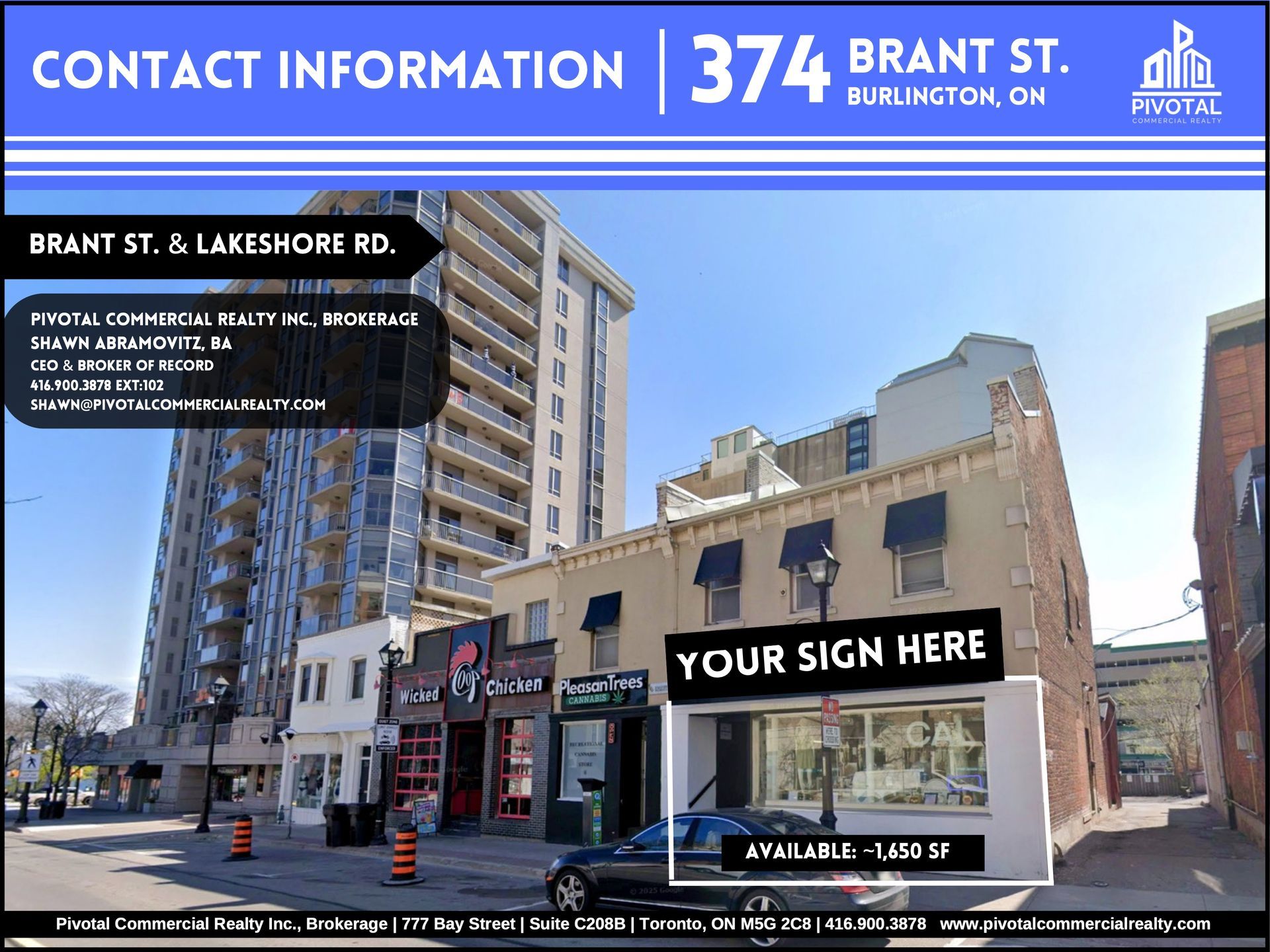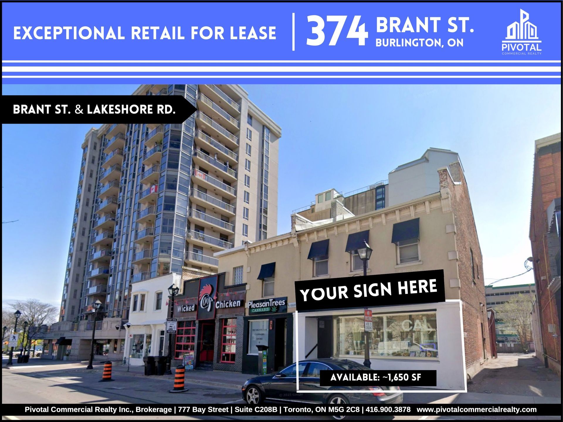 Located in the heart of downtown Burlington, 374 Brant Street presents a rare opportunity to secure ~1,650 SF of prime ground floor retail space in a prominent two-storey commercial building.