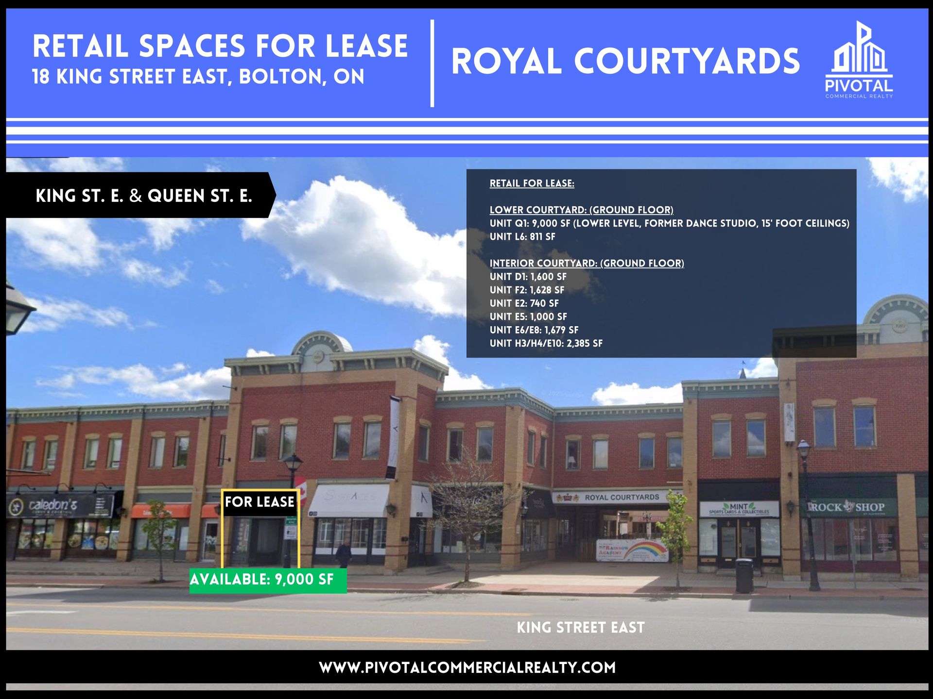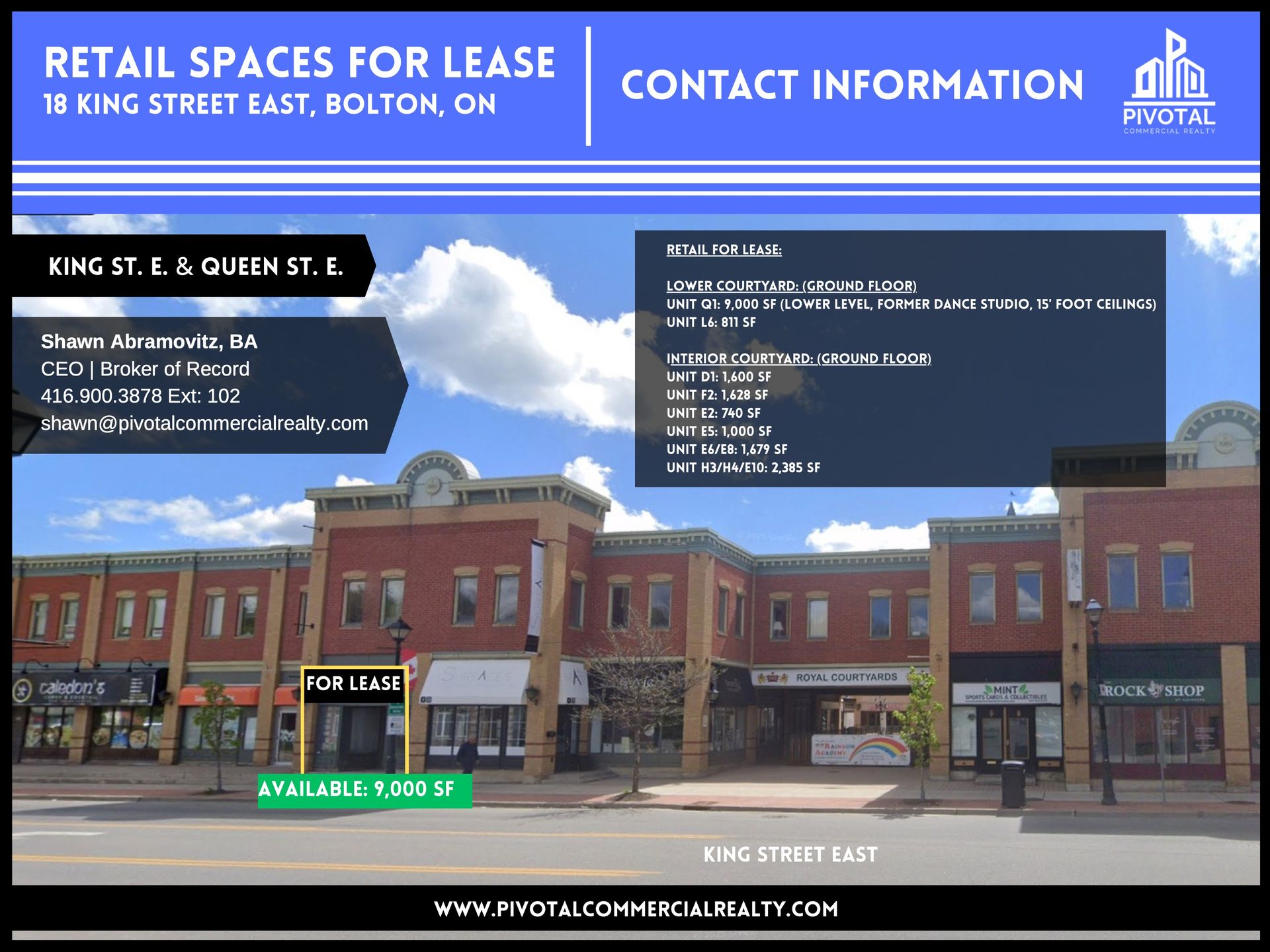 Welcome to Royal Courtyards Service Centre, located at 18 King St. E., in the heart of downtown Bolton, Ontario. A variety of retail spaces are available For Lease.