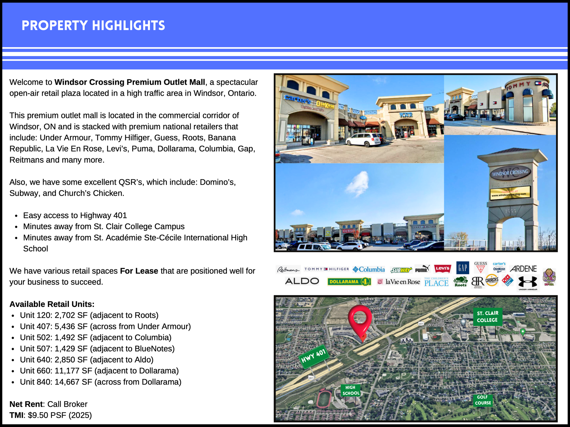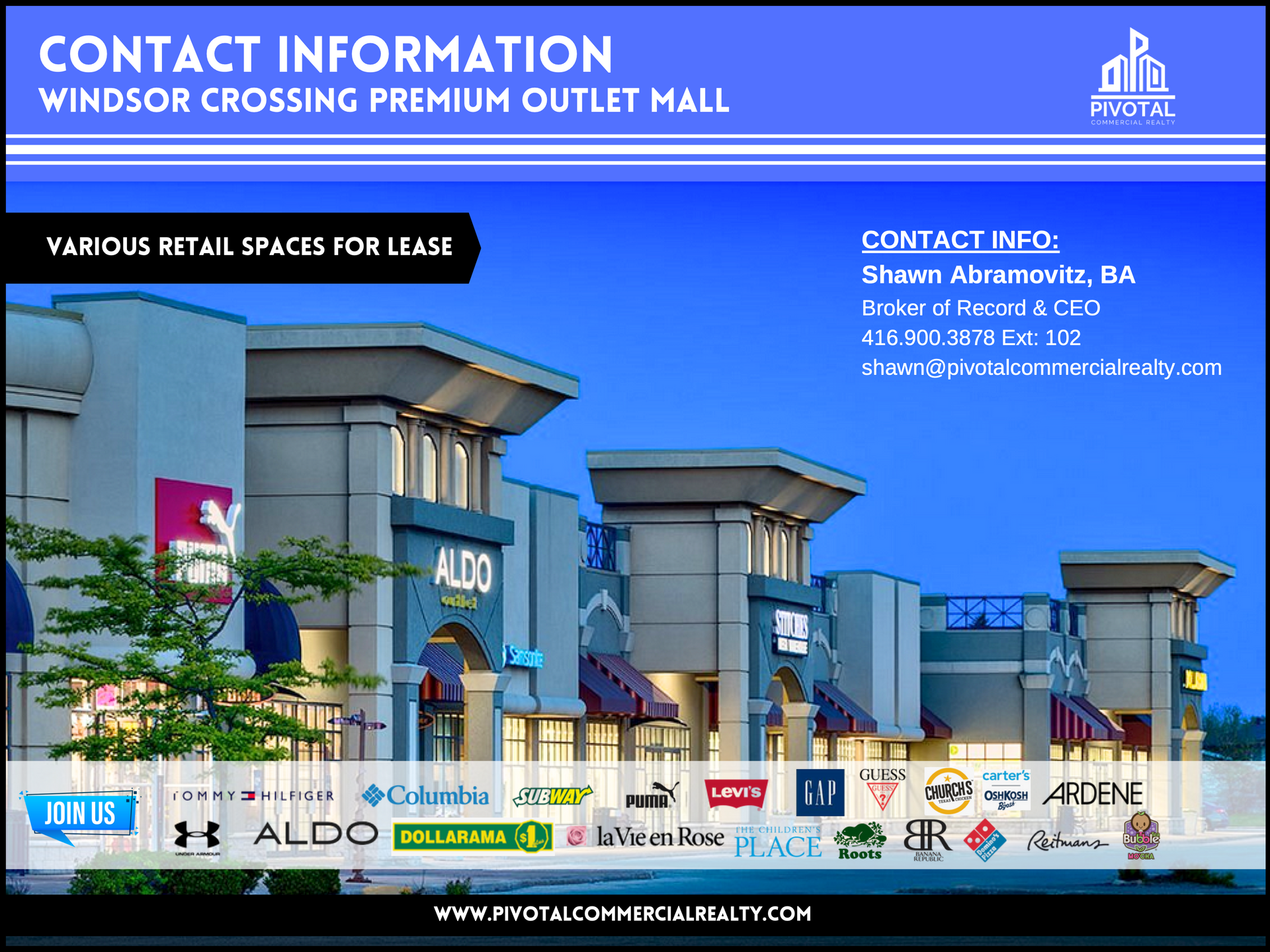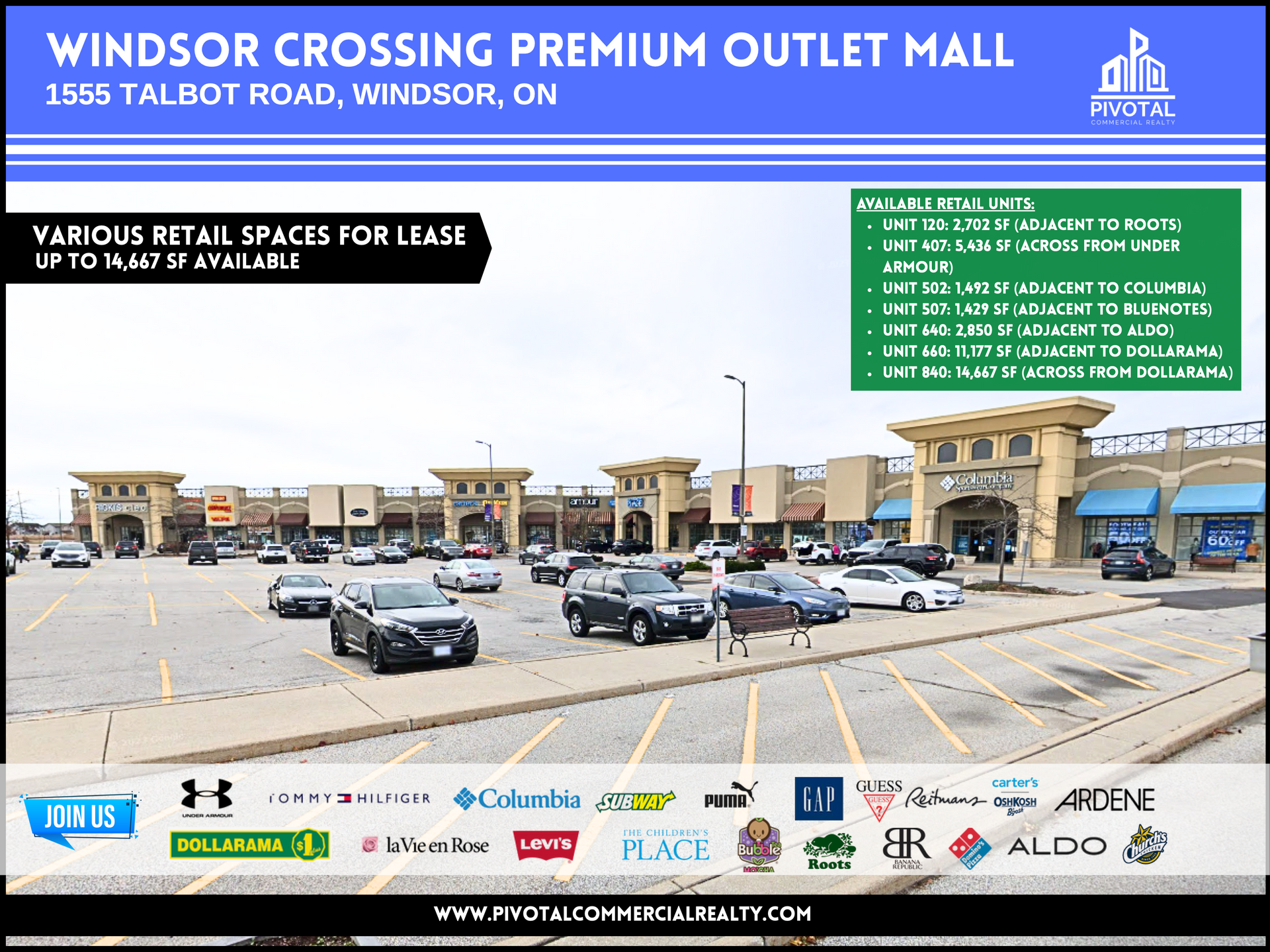 This premium outlet mall is located in the commercial corridor of Windsor, ON and is stacked with premium national retailers that include: Under Armour, Tommy Hilfiger, Guess, Roots, Banana Republic, La Vie En Rose, Levi’s, Puma, Dollarama, Columbia, Gap, Reitmans and many more.